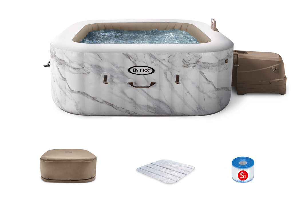 Seating Capacity: Up to 4 people Bubble Jets: 140 high-powered bubble jets Massage Jets: 4 powerful dual jets (set in two corners) Controls: Removable touch display + INTEX Link Spa Management App Water Care: Electronic hard water treatment system Construction: Super-Tough™ puncture-resistant 3-ply laminated material + Fiber-Tech® construction Included: Energy-efficient spa cover, thermal ground cloth, carry bag, and four filter cartridges